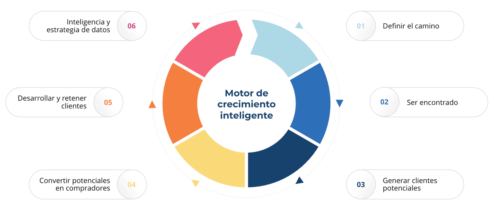 Activamos un sistema circular, de seis elementos, donde la estrategia, el marketing, las ventas y la tecnología operan en sincronía para maximizar su rentabilidad.